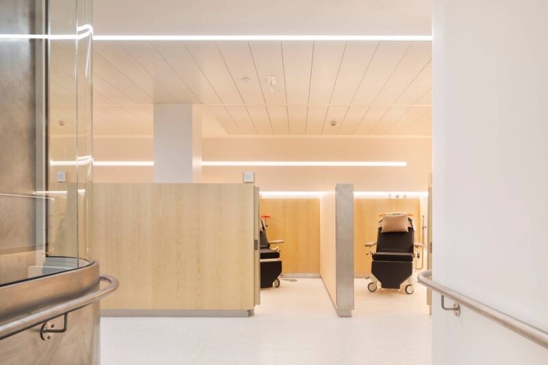 Two surgical day hospitals, each with 20 treatment places, have their own dedicated entrances and are directly connected to the operating suites via short, efficient routes. Vertical connections from the main entrance hall and compact horizontal circulation enable “just‑in‑time” walking transfers, improving operational efficiency while enhancing the experience for both patients and care teams.