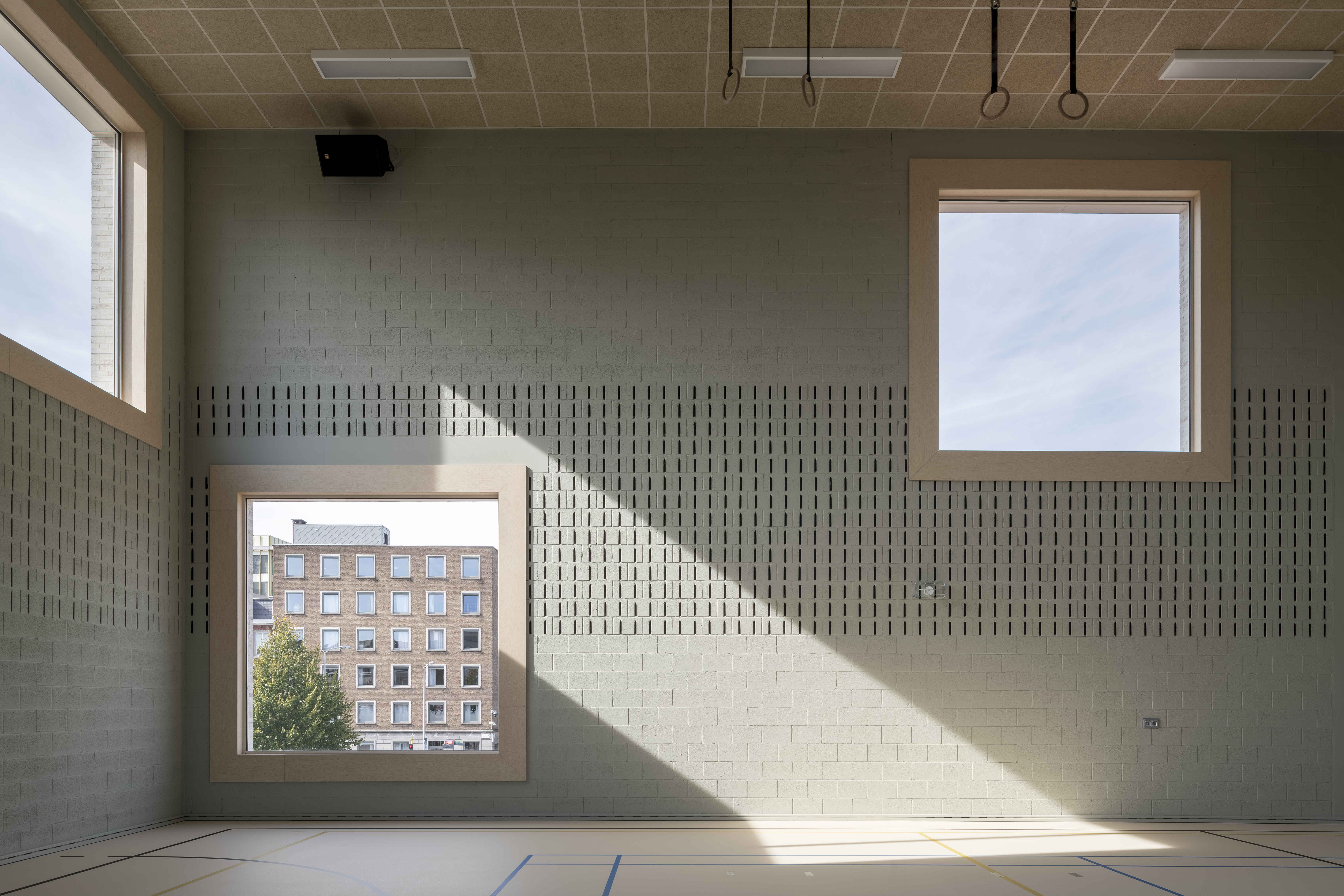 The design allows the greenery of Groeningepark to extend deep into the campus. Playfully placed windows offer views of gardens and park greenery from every angle, creating a sense of calm and connection. Outdoor spaces are designed as play and relaxation areas and are also used for therapy. In a later phase, additional sports infrastructure will be added, including an agility course.