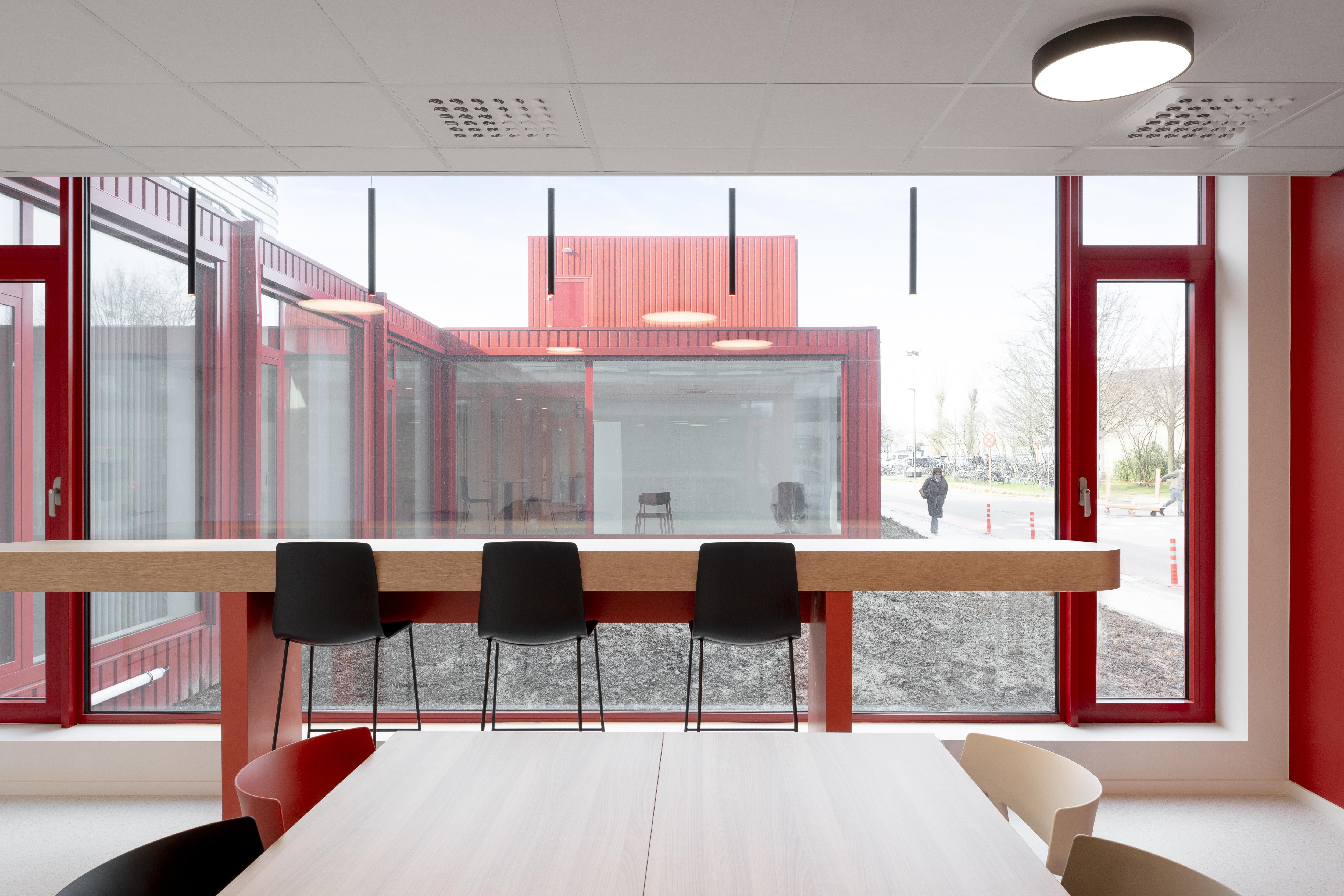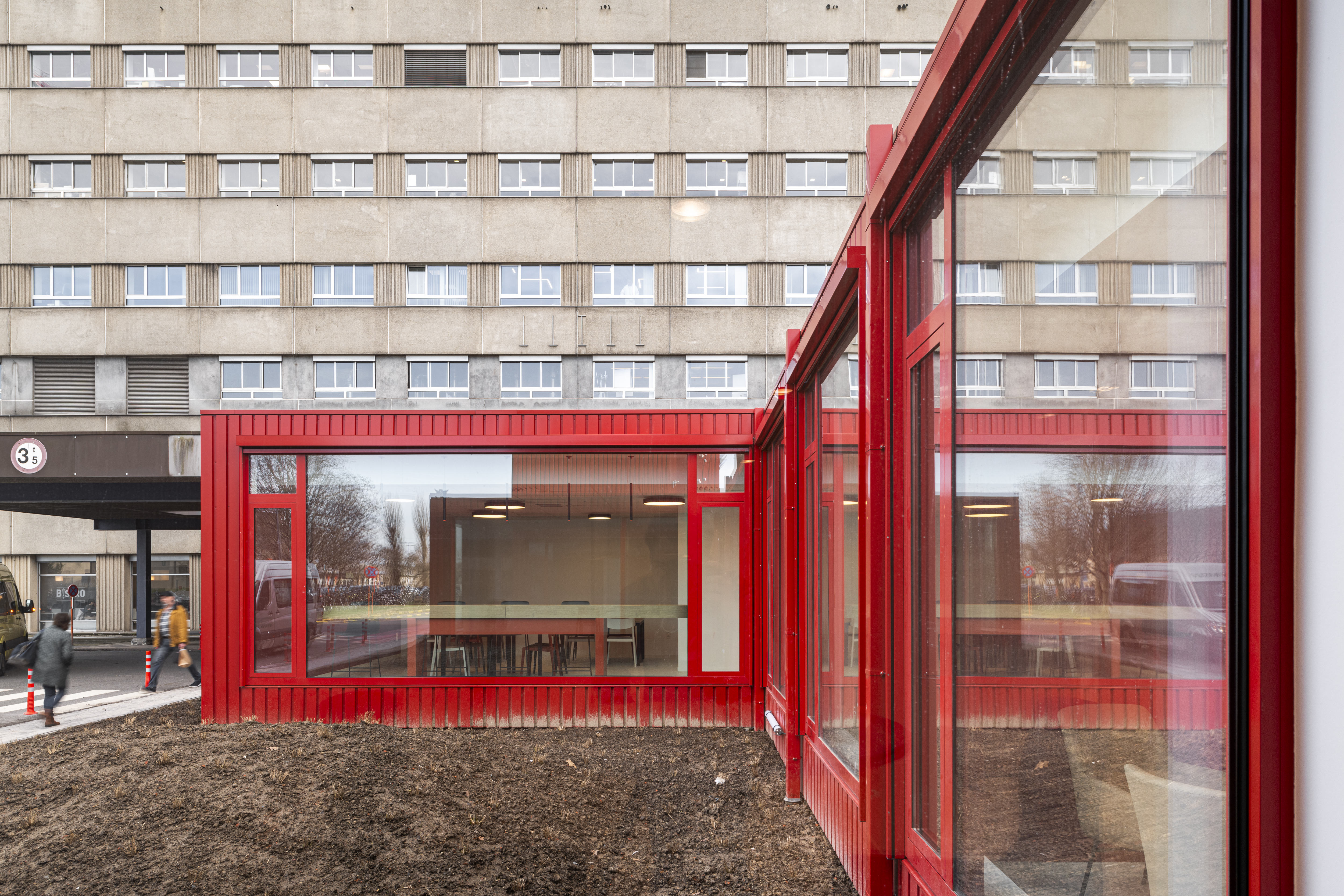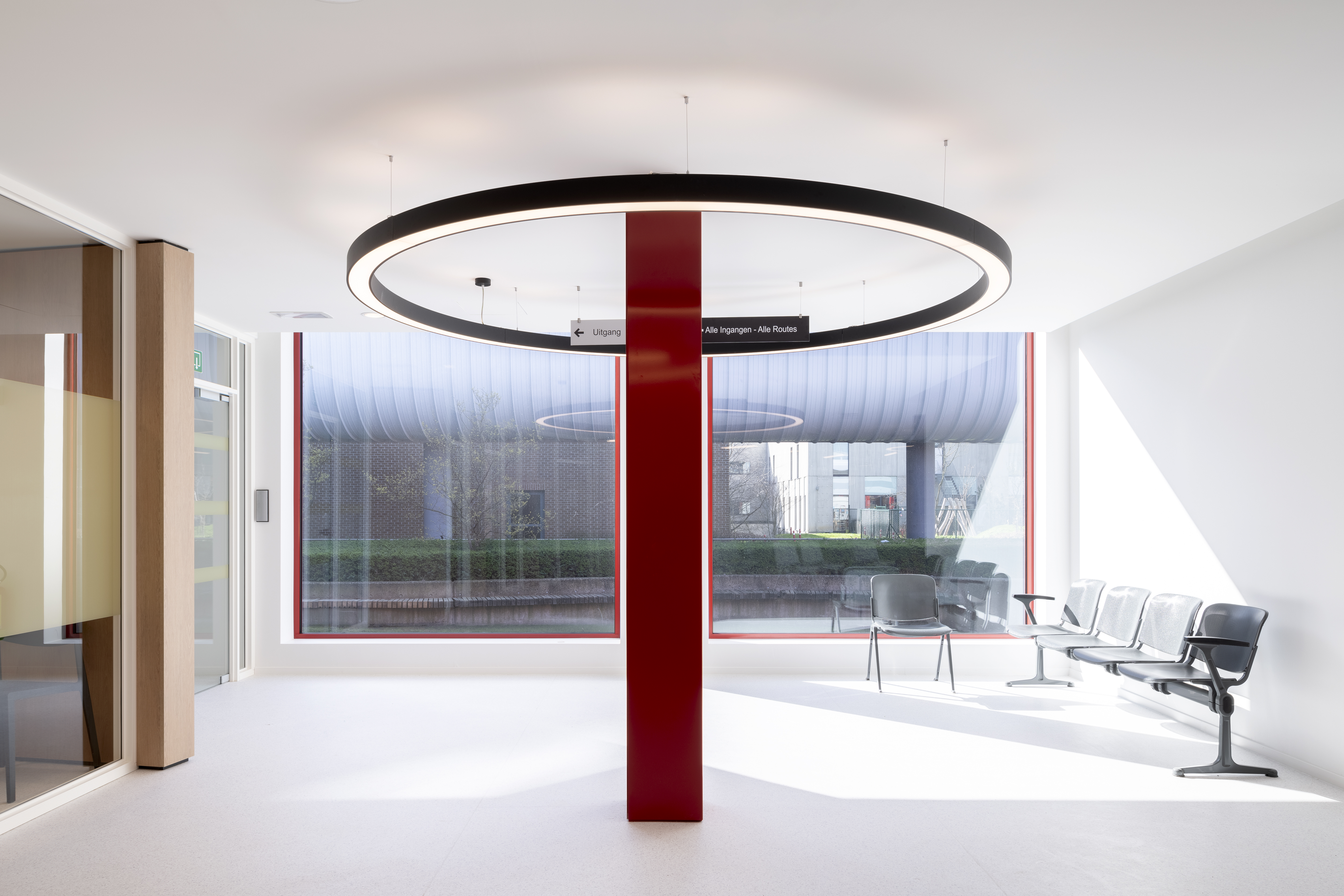 The red façade accents form a powerful contrast with the forecourt and give the pavilion its distinctive appearance. Every visitor immediately knows: this is where my journey through UZ Gent begins.