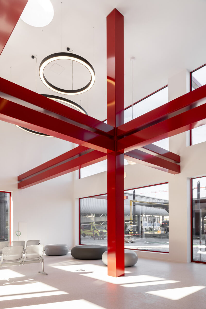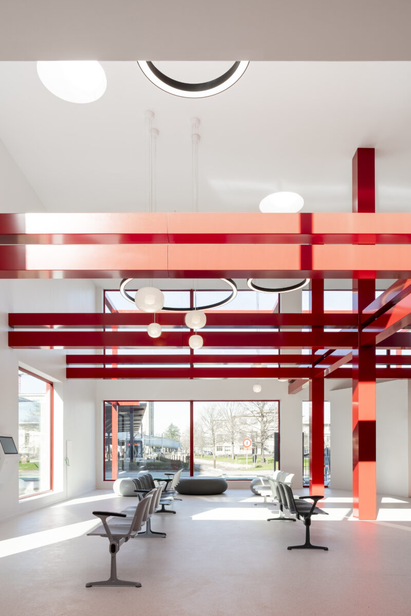 Distinctive paving leads visitors to registration kiosks, reception desks, and consultation rooms. Large floor-to-ceiling windows let in abundant daylight and create an open atmosphere, while preserving visual connection with the campus. A red signal line – the building’s striking signature – naturally guides visitors toward their next destination.