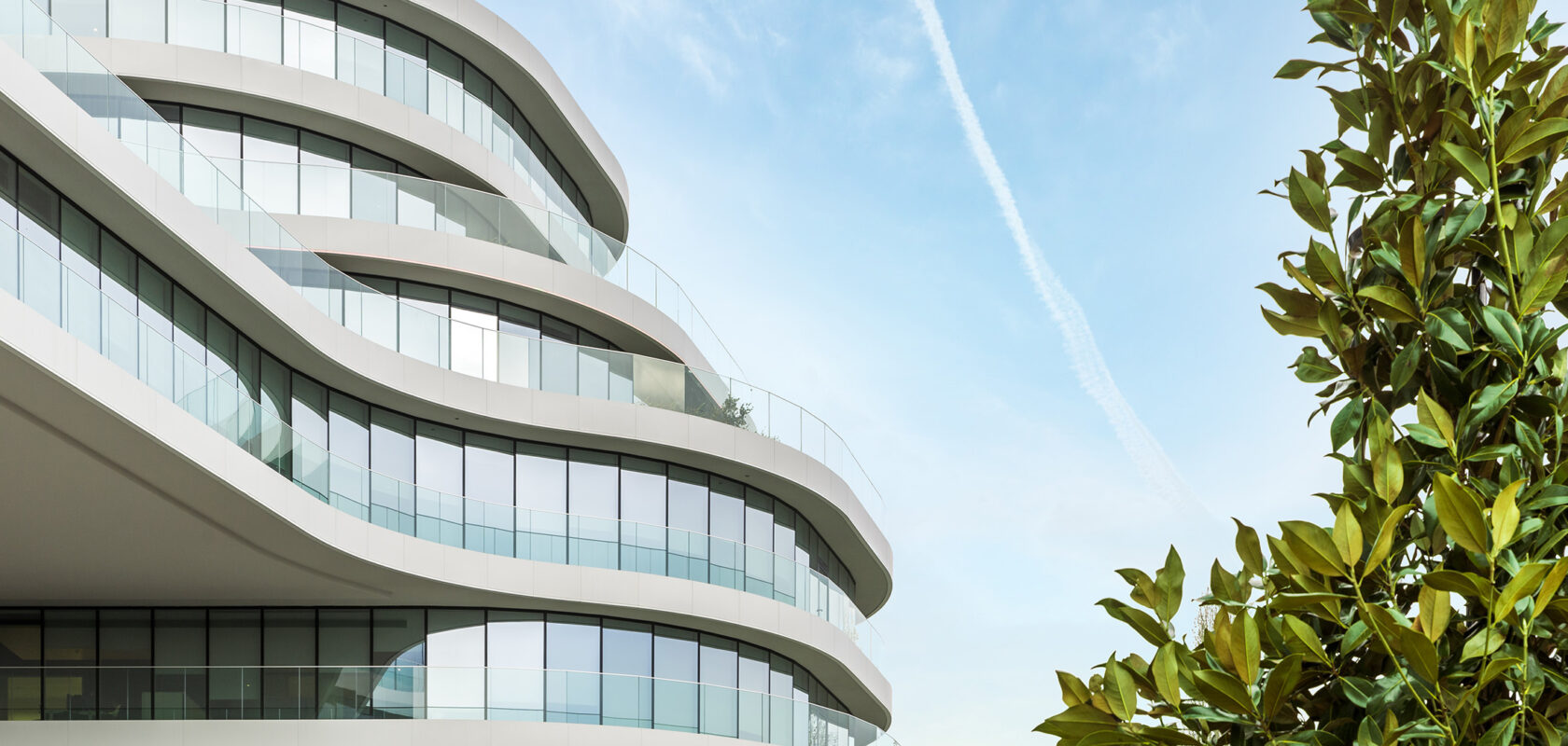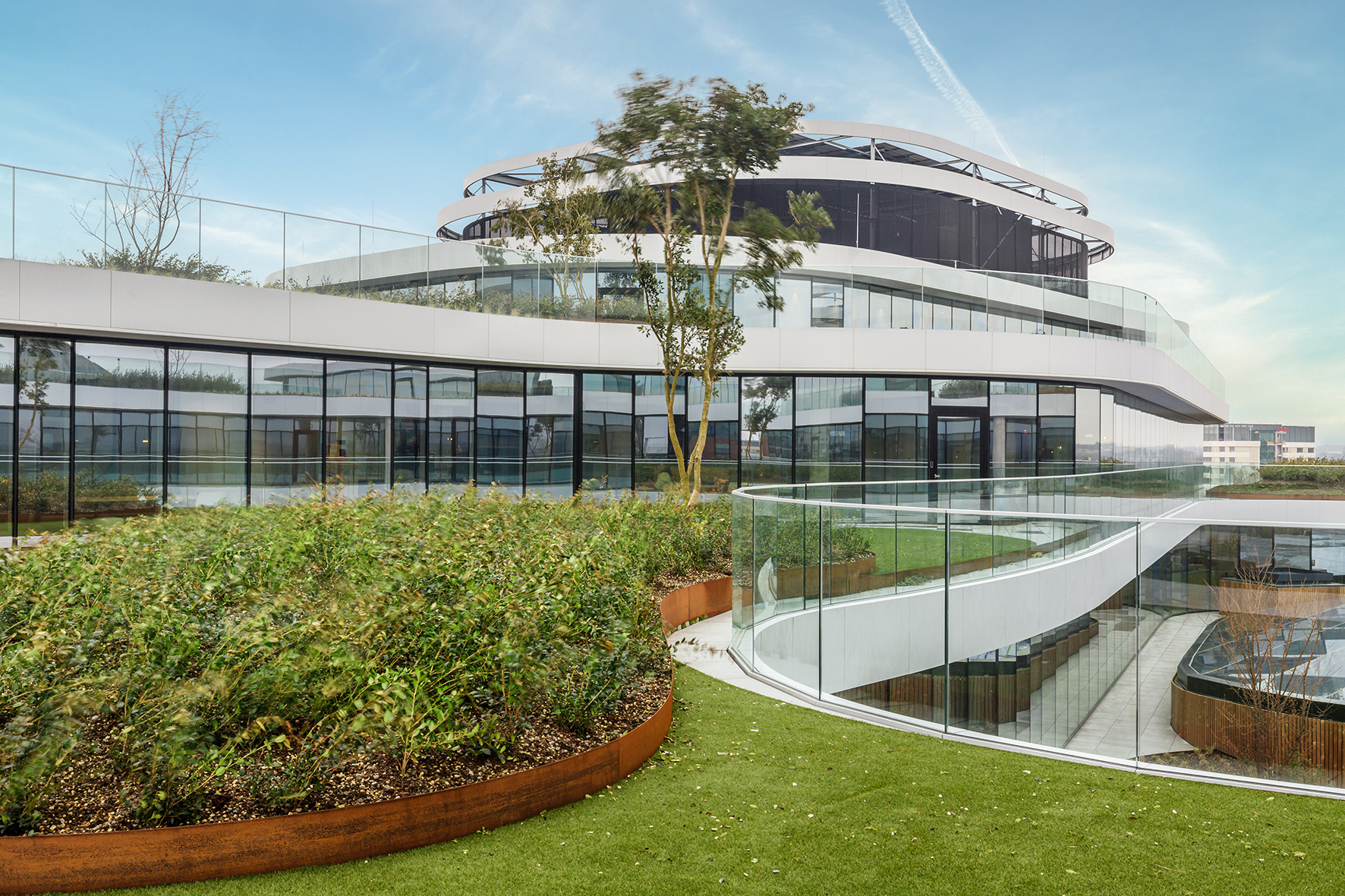 The organic architecture is characterized by rounded corners, expansive glazing, and horizontal divisions in light grey aluminum cladding. Each floor opens onto green terraces, extending into quality outdoor spaces. For the landscaping, the design team collaborated with floral artist Daniel Ost, who translated the building’s flowing lines into a harmonious green framework. The result is a campus where work and well-being are seamlessly integrated.