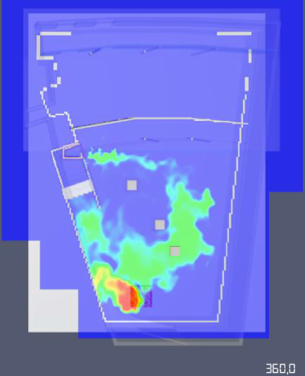 Longueur de vue en vue de dessus, scénario « incendie dans la salle de l’événement » – 2,5 mètres au-dessus du niveau -1 (temps en secondes)