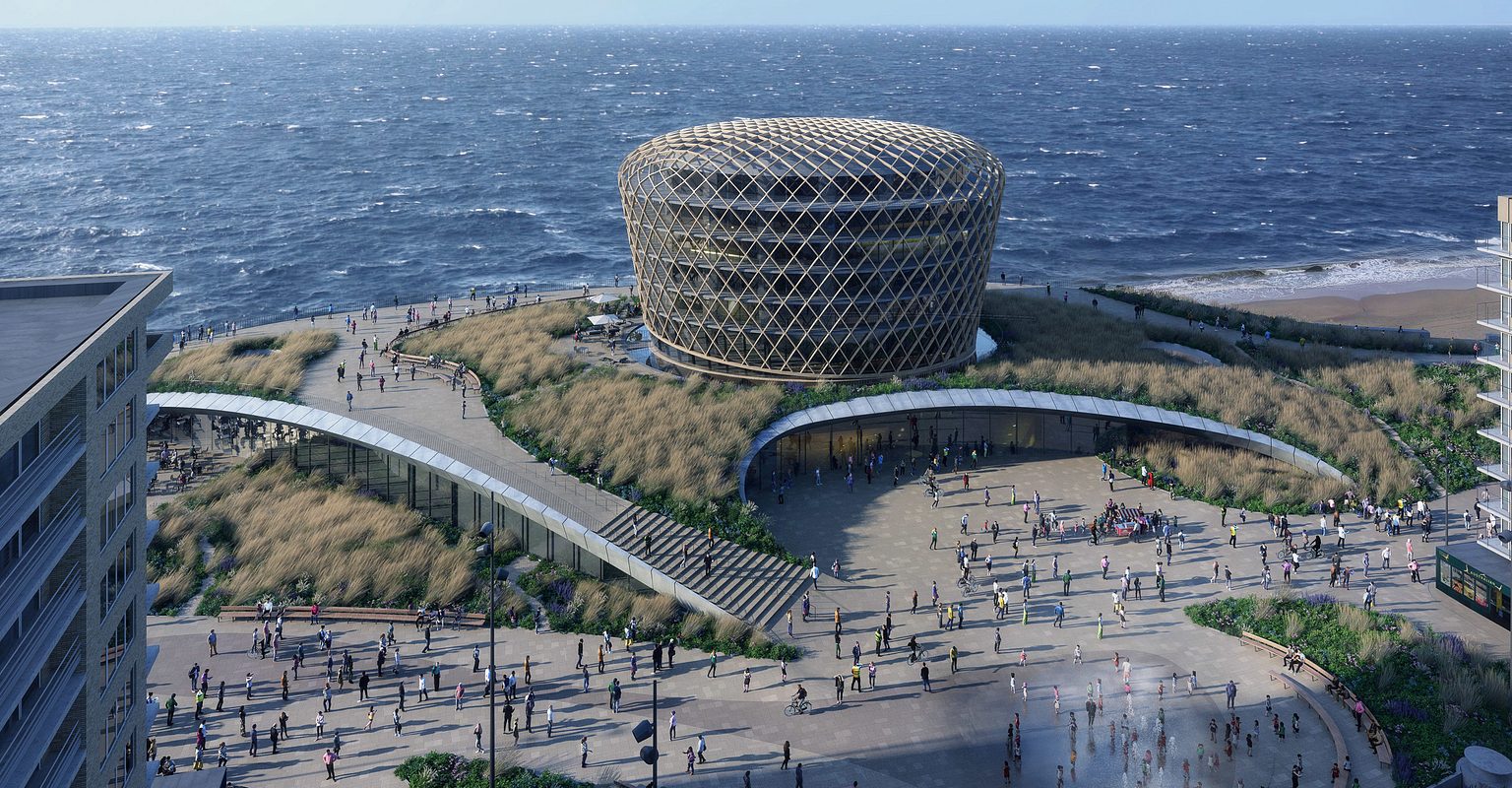 Tout d’abord, le volume de construction modeste avec un panier en bois se dresse au-dessus d’une dune artificielle. Cette dune renforce la digue et cache la salle d’événements, la salle de jeux, le restaurant et un parking souterrain. Les espaces offrent à travers des fenêtres du sol au plafond une vue impressionnante sur la mer. Au sommet de la dune, les piétons profitent d’un parc avec des éléments aquatiques. Ce support de connexion s’étend sur la place Epernay adjacente et crée un grand espace public sans voiture.