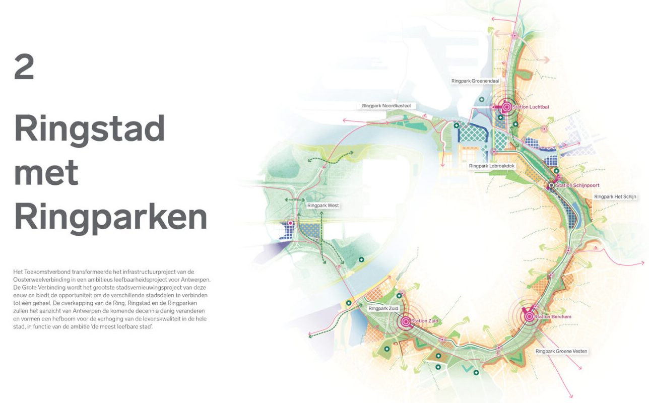 Bovendien leggen we nieuwe, gebiedsgerichte accenten: op de overkapping van de Ring komen zeven grote Ringparken en dit zal zowel de binnenstad als de wijken buiten de ring zuurstof geven. De band met de Schelde wordt verder versterkt, Linkeroever wordt klimaatneutraal en ook de Kanaalzone – waar wonen, werken, water en parken elkaar ontmoeten – wordt een strategische locatie.