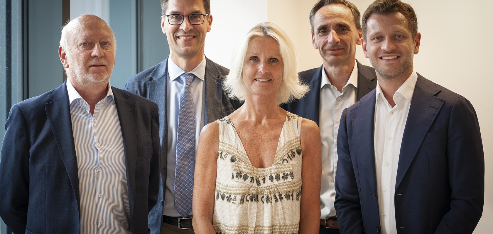 Van links naar rechts: Harry De Smet (oprichter DS Engineering), Erwin Malcorps (Business Area President, Sweco Belgium), Vicky De Bollen (Director Finance, Facility & Legal, Sweco Belgium), Peter Vanhoegaerden (Division Director Buildings, Sweco Belgium), Michaël De Smet (CEO DS Engineering).