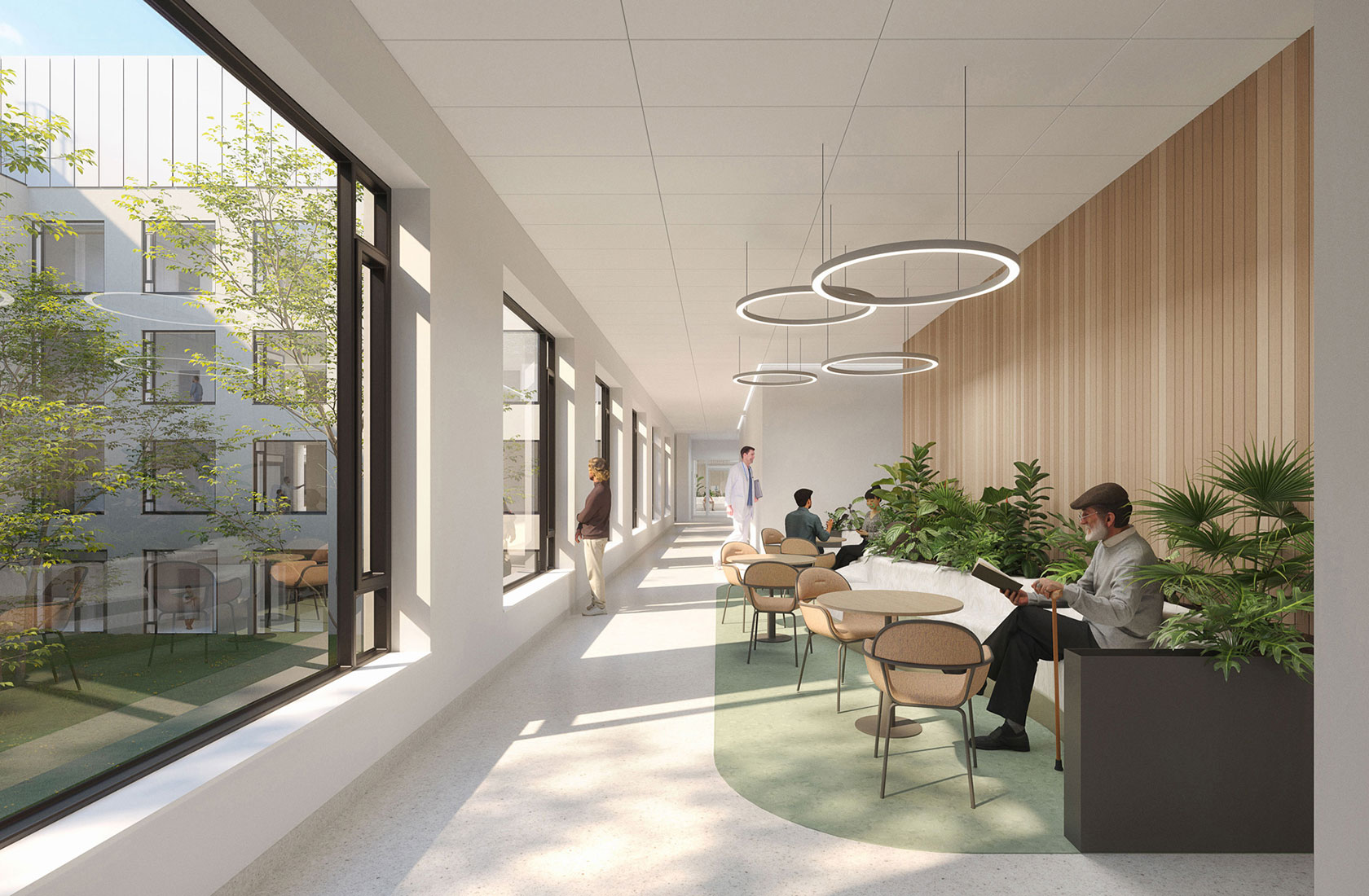 Het ontwerp zet sterk in op het welzijn en comfort van patiënten. Elke kamer beschikt over daglicht en uitzicht op het stadspark of de patio. Warme materialen, doordachte kleurtoepassing en rustgevende groene zones dragen bij aan een helende omgeving. Voor palliatieve en psychiatrische patiënten zijn er bovendien toegankelijke daktuinen.