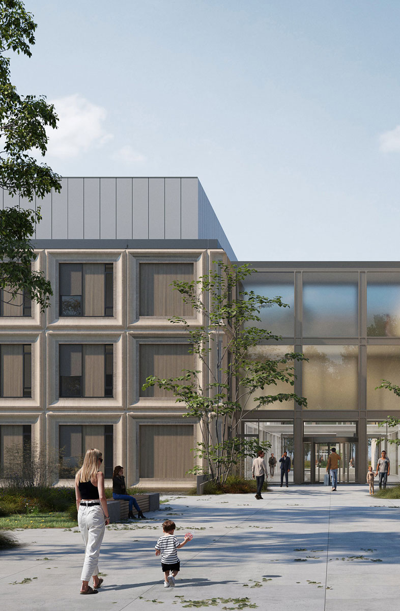 Het nieuwe gebouw wordt kleiner dan het huidige ziekenhuis en bestaat uit twee hoofdvolumes, verbonden door een hoge, transparante inkomhal. In de ene vleugel bevinden zich de opnameafdelingen en consultaties; in de andere een hoogtechnologische zorgzone met onderzoek- en behandelingsruimtes, de “hot floor”, spoedgevallen, medische beeldvorming en een oncologisch dagcentrum.