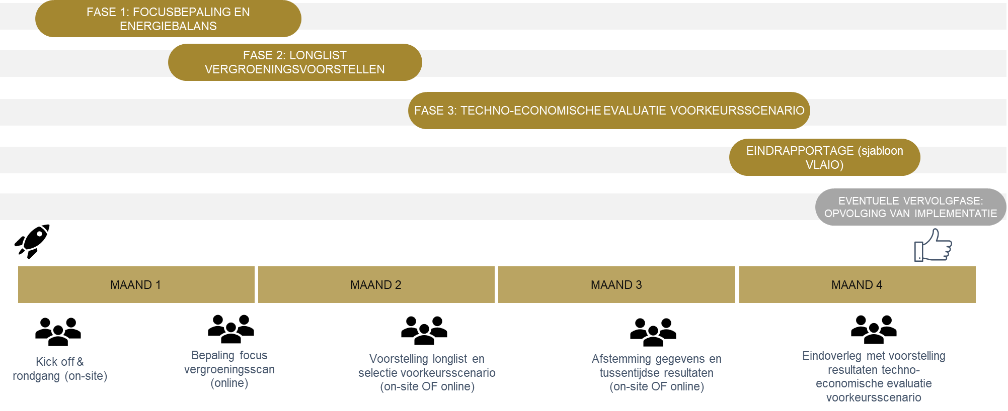- De vergroeningsscan is dus een gesubsidieerde voorstudie die één technologie/installatie of een specifieke groep verbruikers onderzoekt. Deze concrete vergroeningscase kan in een later stadium mogelijk op investeringssteun rekenen (zoals Ecologiepremie+, GREEN, Call Groene Warmte).